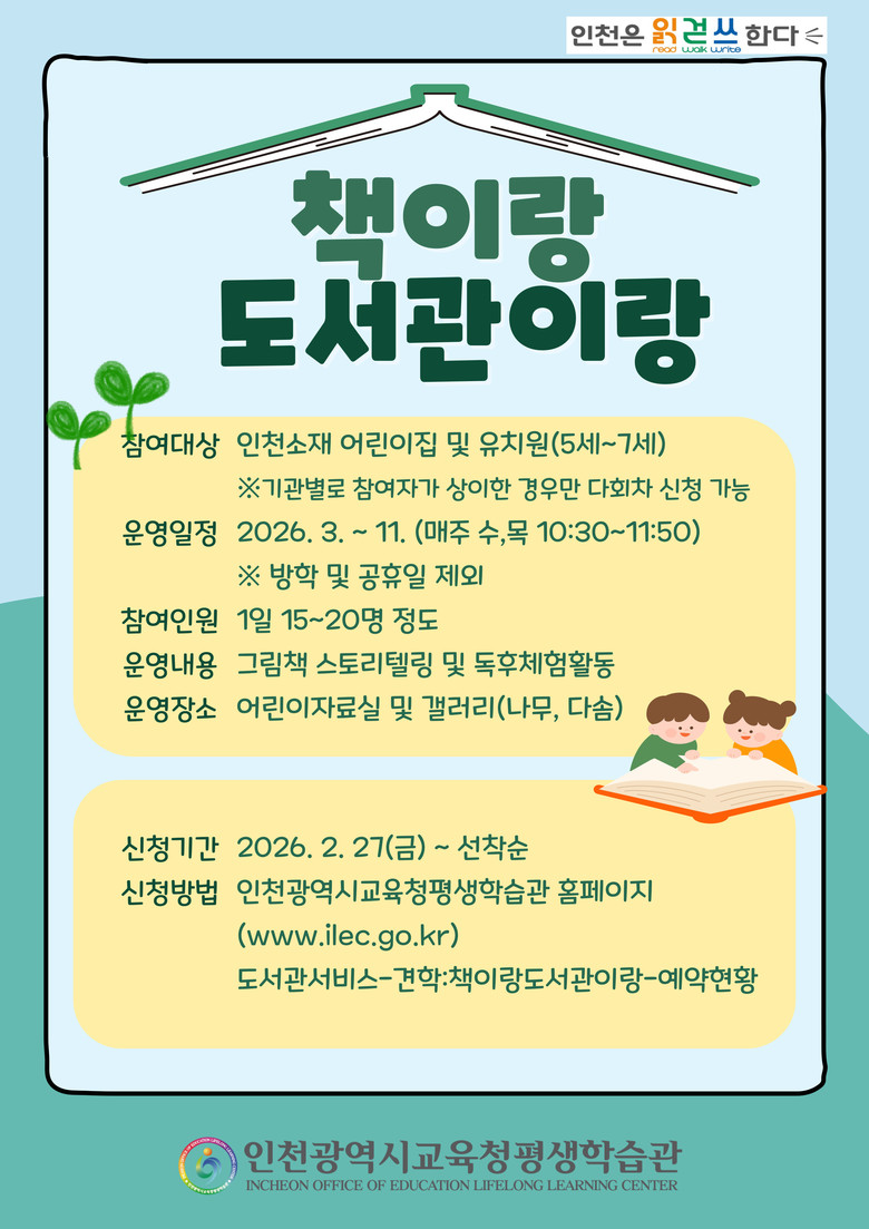 참여 신청은 평생학습관 누리집에서 27일부터 가능하며, 자세한 사항은 어린이자료실(☎032-899-1552~3)로 문의하면 된다.