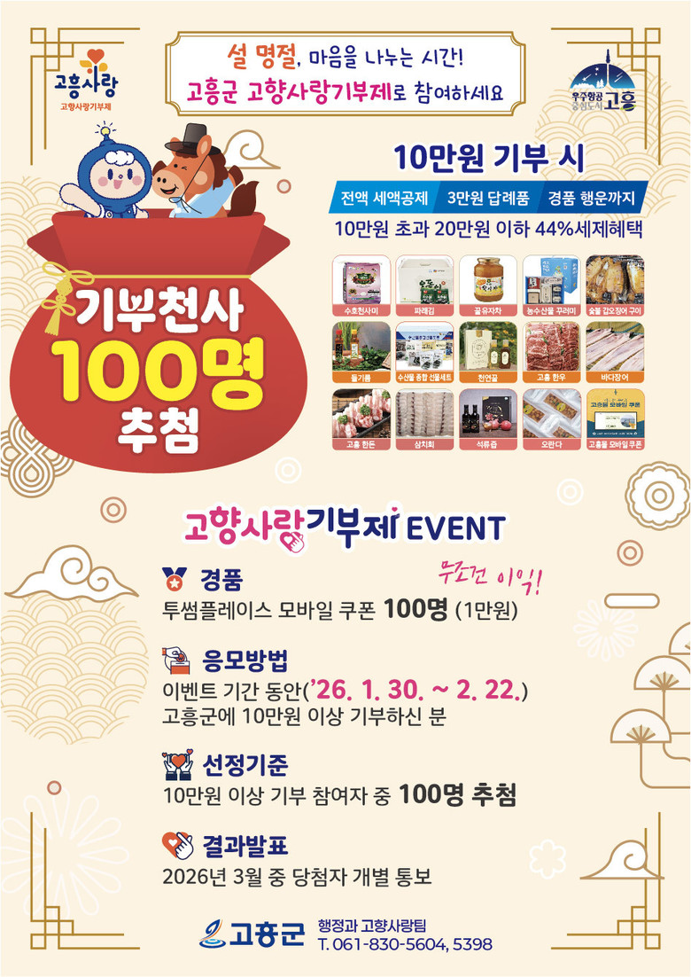 고흥군은 설맞이 기부 참여 확산을 위해 군 자체 이벤트도 함께 추진한다. 이벤트 기간 중 고향사랑e음, 웰로, 위기브 등을 통해 고흥군에 10만 원 이상 기부한 참여자는 별도 신청 없이 자동 응모되며, 추첨을 통해 총 100명에게 투썸플레이스 모바일 상품권(1만 원 상당)을 제공할 예정이다.